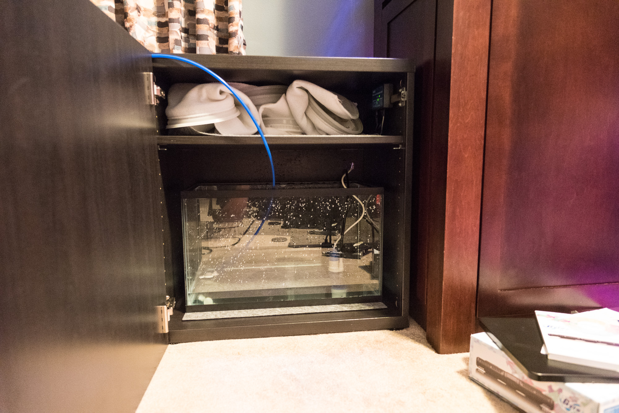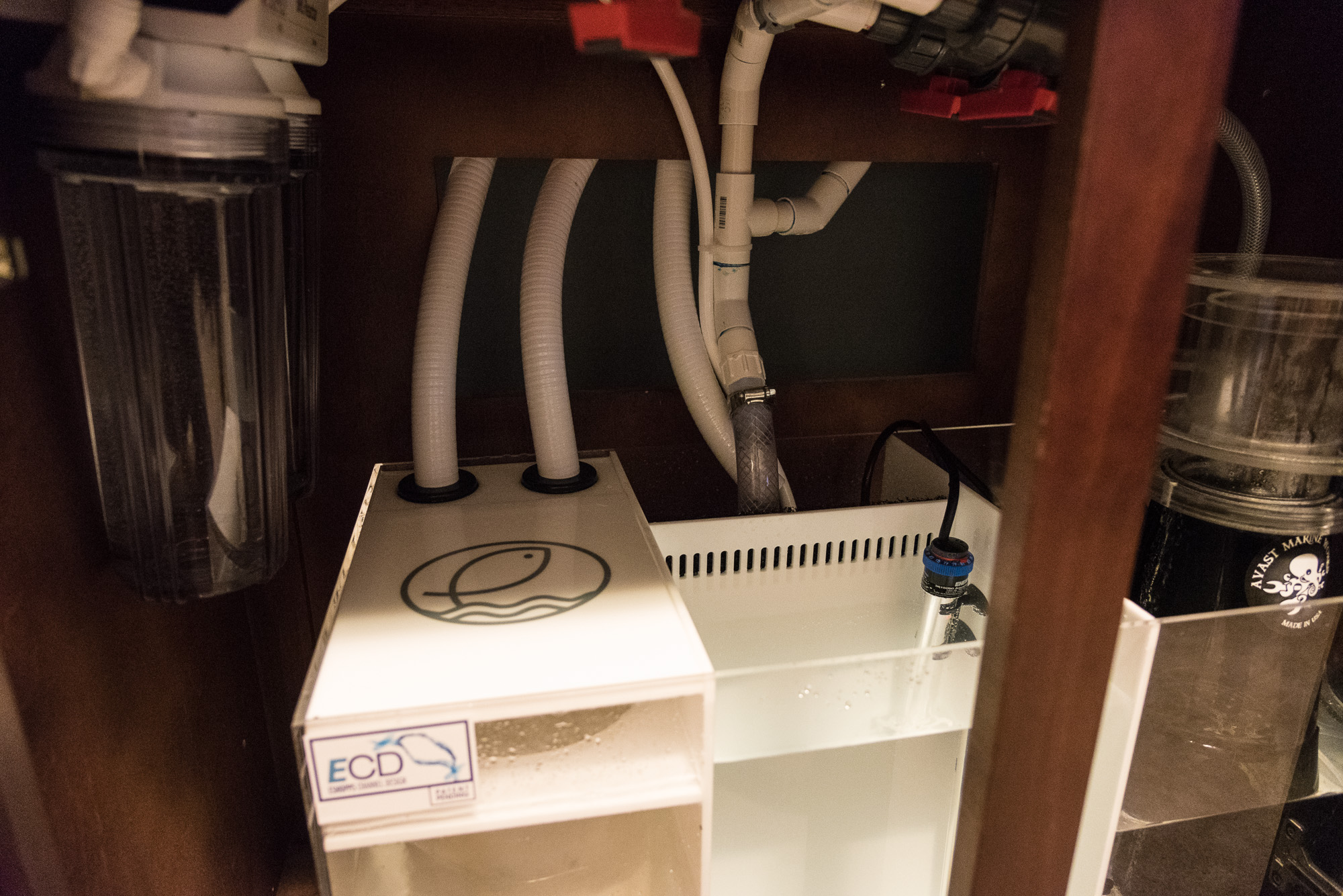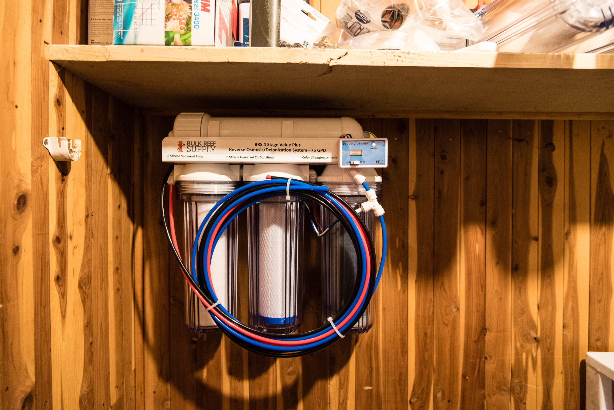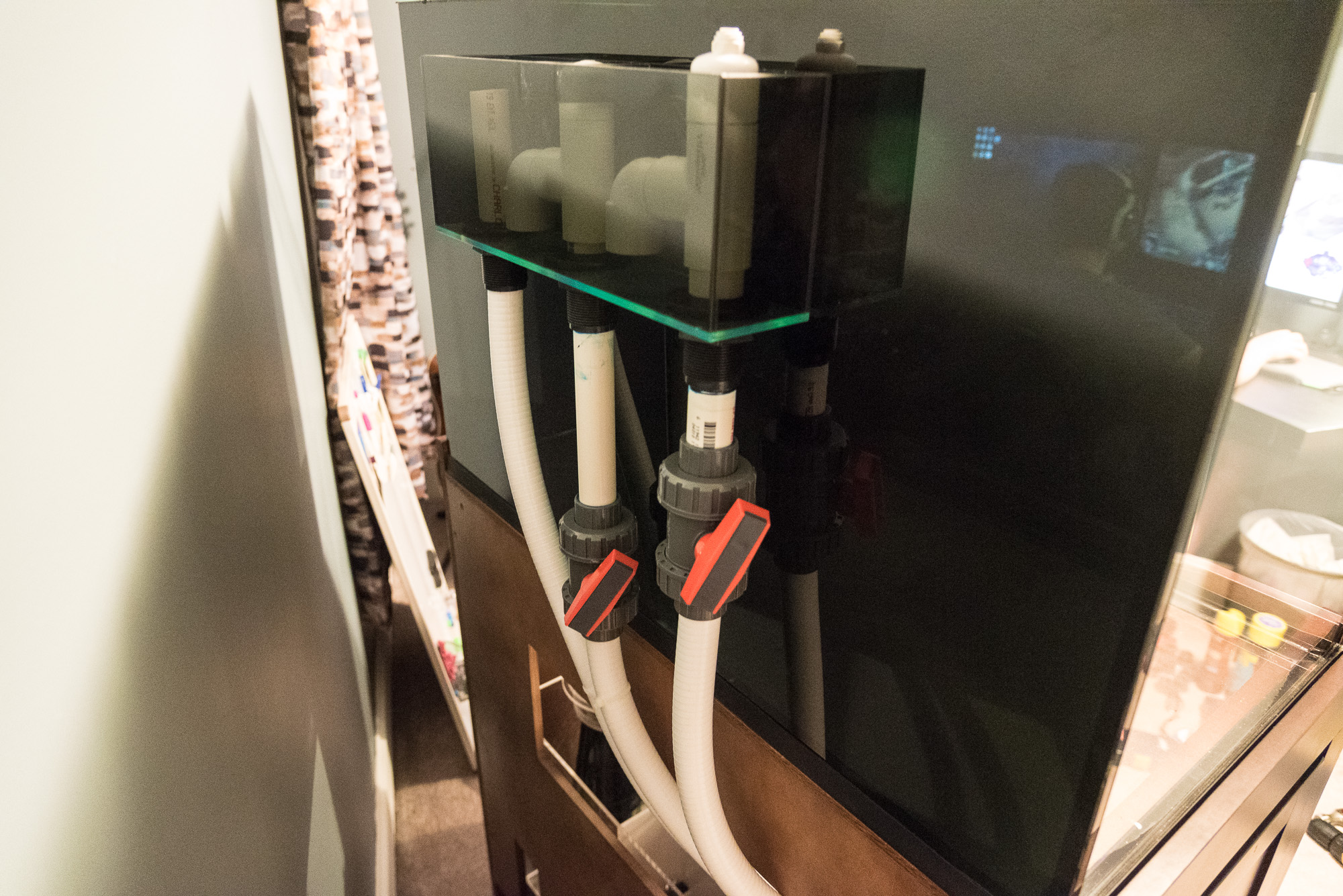 The first, and most important, aspect of the build is: the tank. After making many phone calls and getting many quotes, I decided that a custom tank was the route I wanted to take. The room is quite small so I couldn’t fit anything too large in it, but the dimensions I wanted are ever so slightly non-standard. I also wanted to maximize my in-tank real estate by leveraging an external overflow box and I did not want to drill a tank myself. Initially, I really wanted a Reef Savvy tank but the lead time on their builds is almost 1-year, so I went with my second choice: Miracles in Glass. The home office is only about an 8’x12′ room, but it has a walk in closet that happens to be close to an access panel for plumbing, so it’s kind of perfect. When deciding on the tank dimensions I wanted to factor in the room size, as well as having areas to put electronics, auto top-off/dosing reservoirs, etc. I settled on a size very close to a traditional 65-gallon: 36″W x 20″D x 24″H, which works out to about 70-gallons, I would be lying if I said I wasn’t tempted to try to squeeze something over 100 gallons into the room but I am glad I didn’t. Some would argue that it was foolish to pay the extra money for something so close to an off-the-shelf size as a custom build, but I would argue otherwise. The tank is 3 sides starphire (low-iron) glass at 1/2″ thickness. It is built in all black silicone with a euro-braced top which is drilled for the two returns which come out in the front. The back is black internally tinted glass, tempered after drilling. I had a difficult time deciding between the modern and stylish looking rimless tanks and a traditional canopy top and since we have a very curious cat, we settled on the canopy. The stand is a 36″ high (6″ higher than standard aquarium stands) solid maple hard wood with custom cutouts in the back and a full wood top. The canopy matches and both were built by Miracles. The overflow is a ghost overflow style external box by Synergy Reef and is plumed in a Bean Animal style 3-drain setup and runs 100% dead silent.