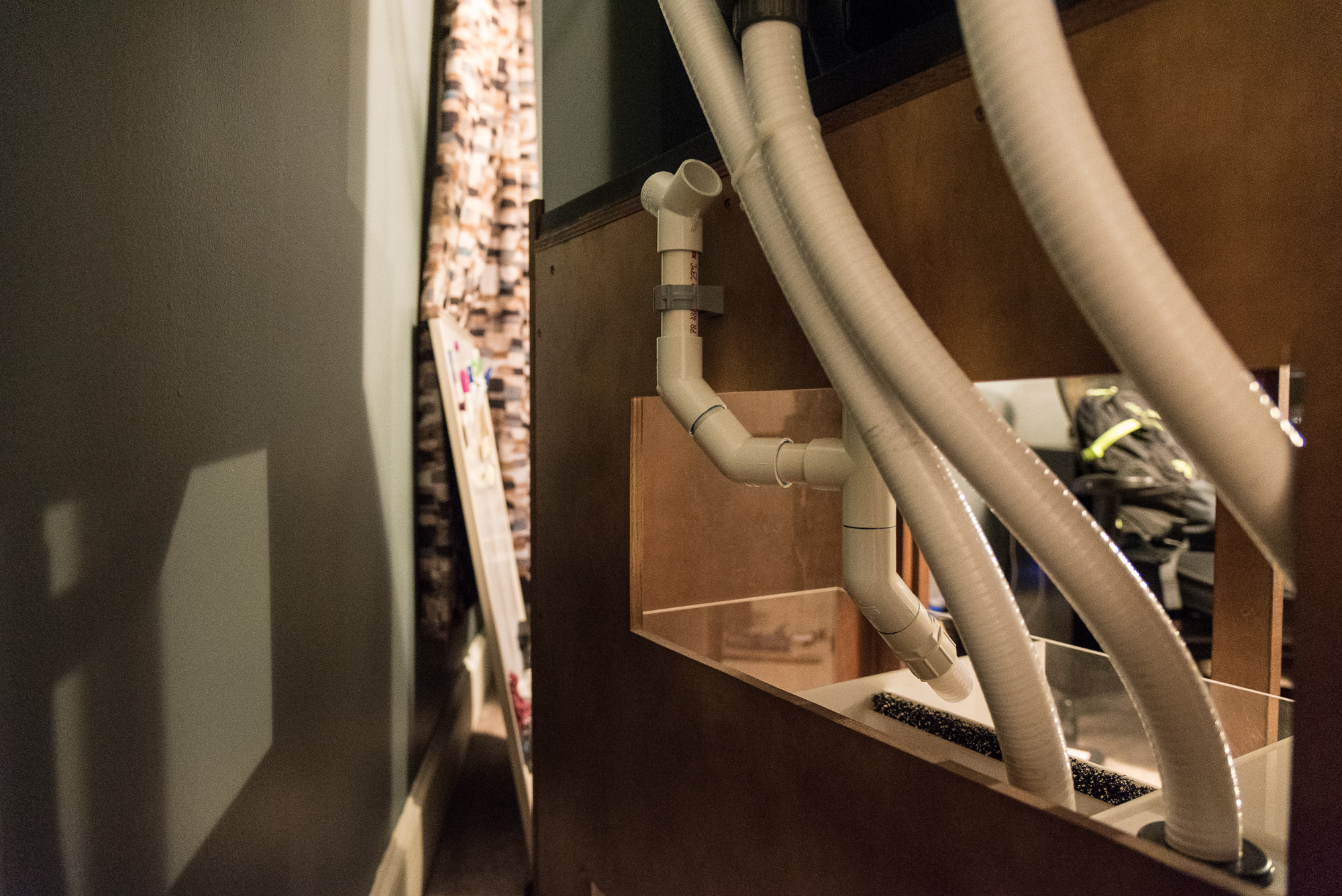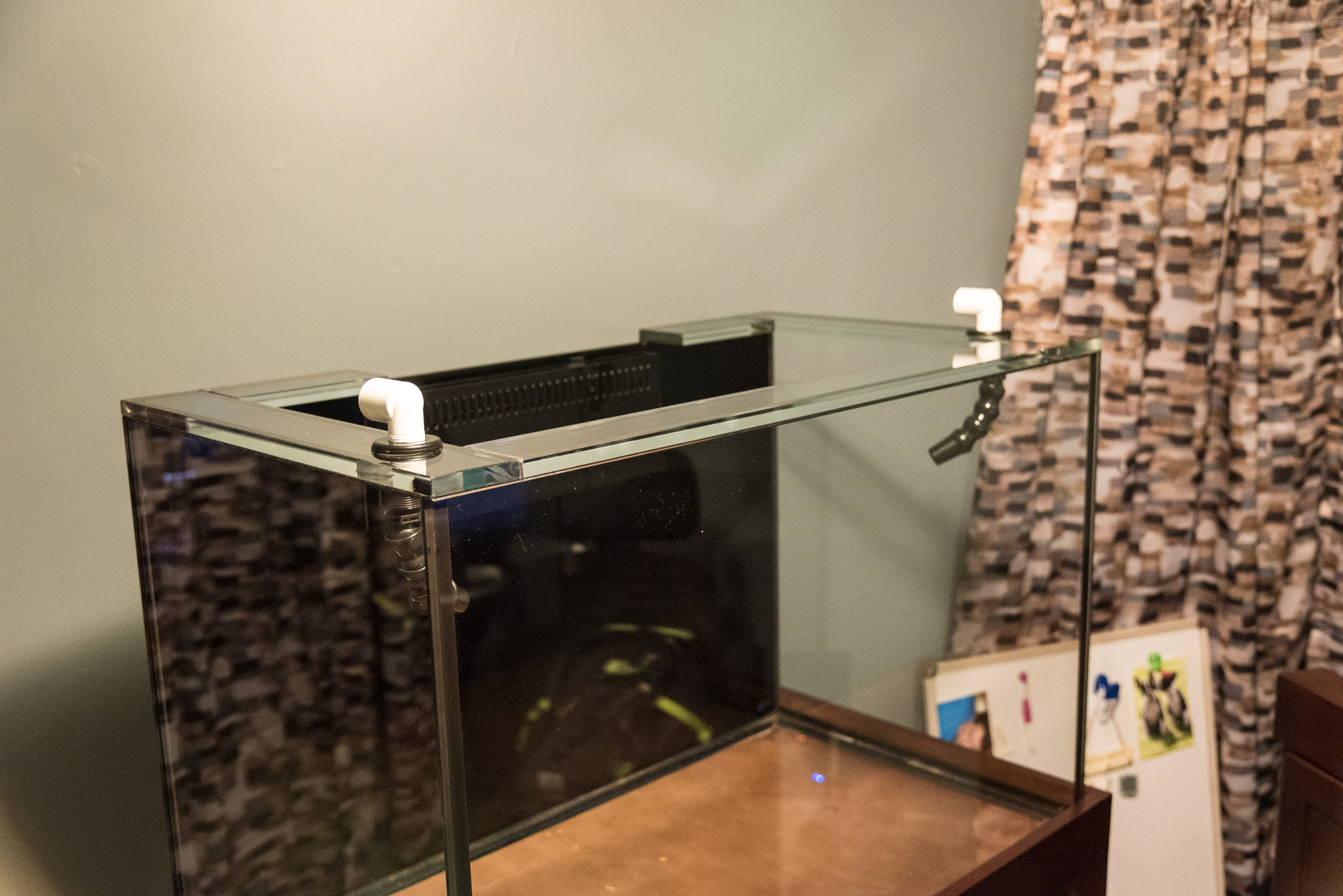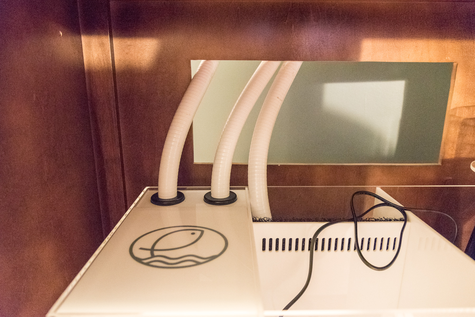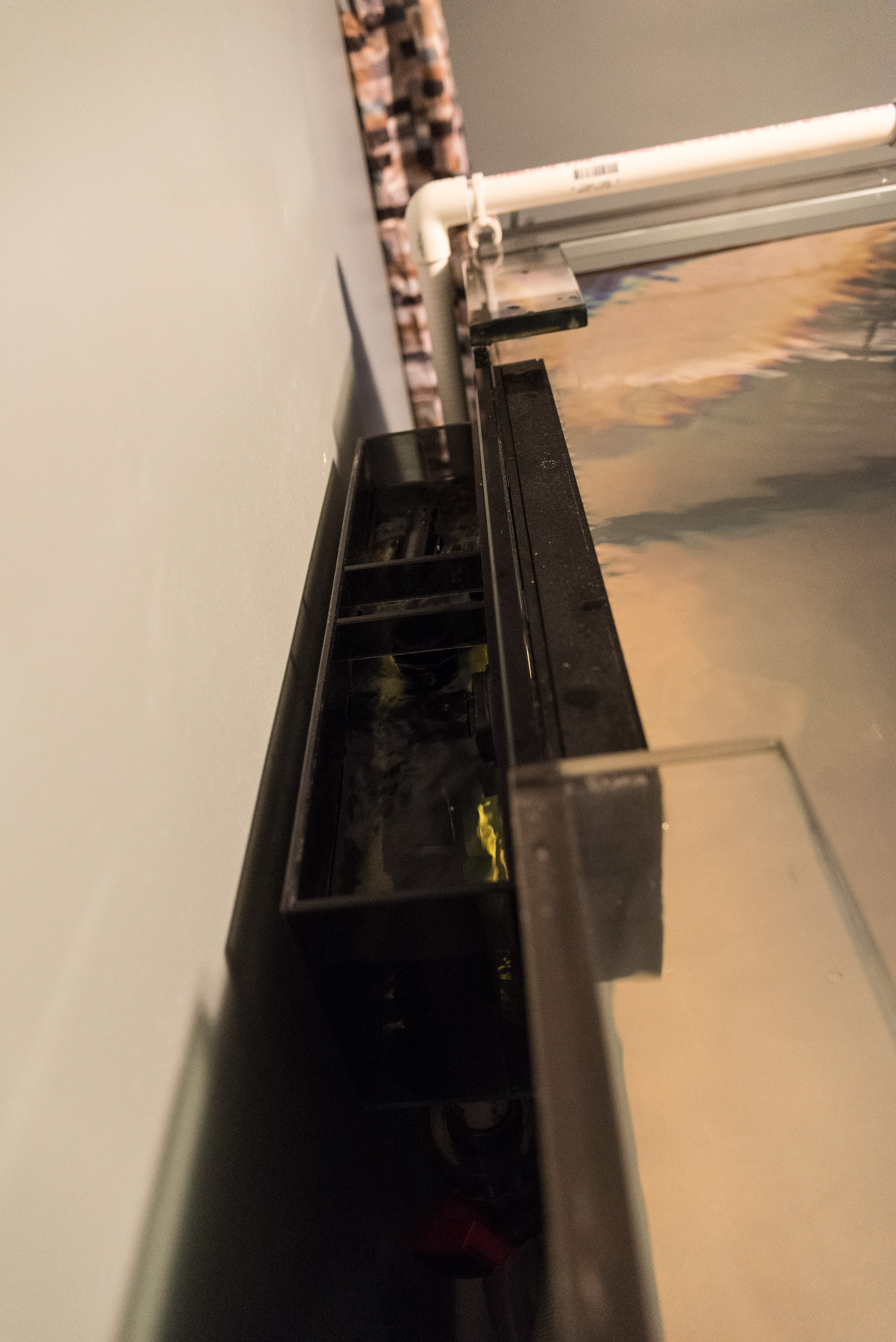 The first, and most important, aspect of the build is: the tank. After making many phone calls and getting many quotes, I decided that a custom tank was the route I wanted to take. The room is quite small so I couldn’t fit anything too large in it, but the dimensions I wanted are ever so slightly non-standard. I also wanted to maximize my in-tank real estate by leveraging an external overflow box and I did not want to drill a tank myself. Initially, I really wanted a Reef Savvy tank but the lead time on their builds is almost 1-year, so I went with my second choice: Miracles in Glass. The home office is only about an 8’x12′ room, but it has a walk in closet that happens to be close to an access panel for plumbing, so it’s kind of perfect. When deciding on the tank dimensions I wanted to factor in the room size, as well as having areas to put electronics, auto top-off/dosing reservoirs, etc. I settled on a size very close to a traditional 65-gallon: 36″W x 20″D x 24″H, which works out to about 70-gallons, I would be lying if I said I wasn’t tempted to try to squeeze something over 100 gallons into the room but I am glad I didn’t. Some would argue that it was foolish to pay the extra money for something so close to an off-the-shelf size as a custom build, but I would argue otherwise. The tank is 3 sides starphire (low-iron) glass at 1/2″ thickness. It is built in all black silicone with a euro-braced top which is drilled for the two returns which come out in the front. The back is black internally tinted glass, tempered after drilling. I had a difficult time deciding between the modern and stylish looking rimless tanks and a traditional canopy top and since we have a very curious cat, we settled on the canopy. The stand is a 36″ high (6″ higher than standard aquarium stands) solid maple hard wood with custom cutouts in the back and a full wood top. The canopy matches and both were built by Miracles. The overflow is a ghost overflow style external box by Synergy Reef and is plumed in a Bean Animal style 3-drain setup and runs 100% dead silent.