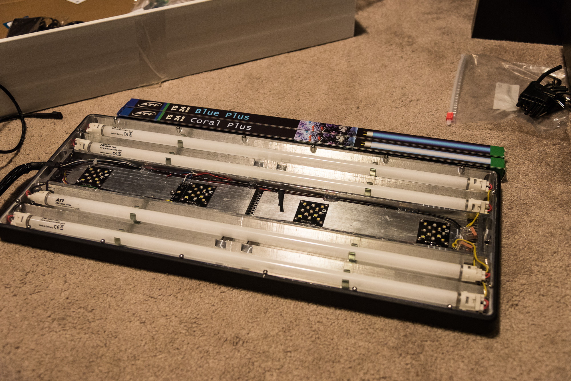 I can’t say enough good things about this light, Dave and his company, the the overall build quality of the device and my experience working with him. I am absolutely stunned with the output. Currently I have it set up on a natural bell curve between 8am and 9pm with a peak output of 40% on the white channel and 60% on the blue channel. The T5 configuration is 2x ATI Coral Plus and 2x ATI Blue Plus bulbs which are on from noon until 7pm. I am still playing with how I have it set up based on how the few corals I have react to it, but right now I am very happy with the appearance of this configuration and the corals seem to be responding quite well.
