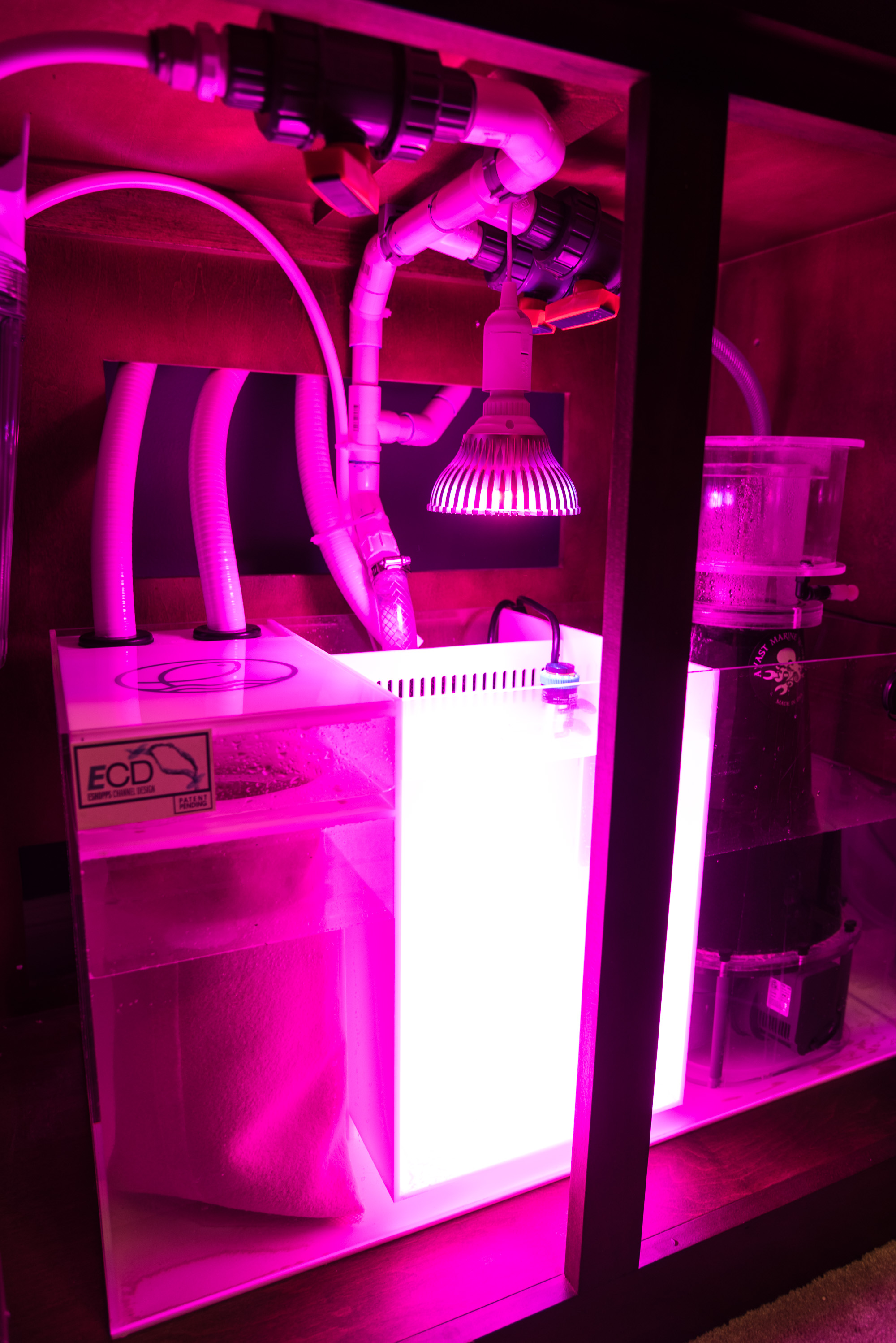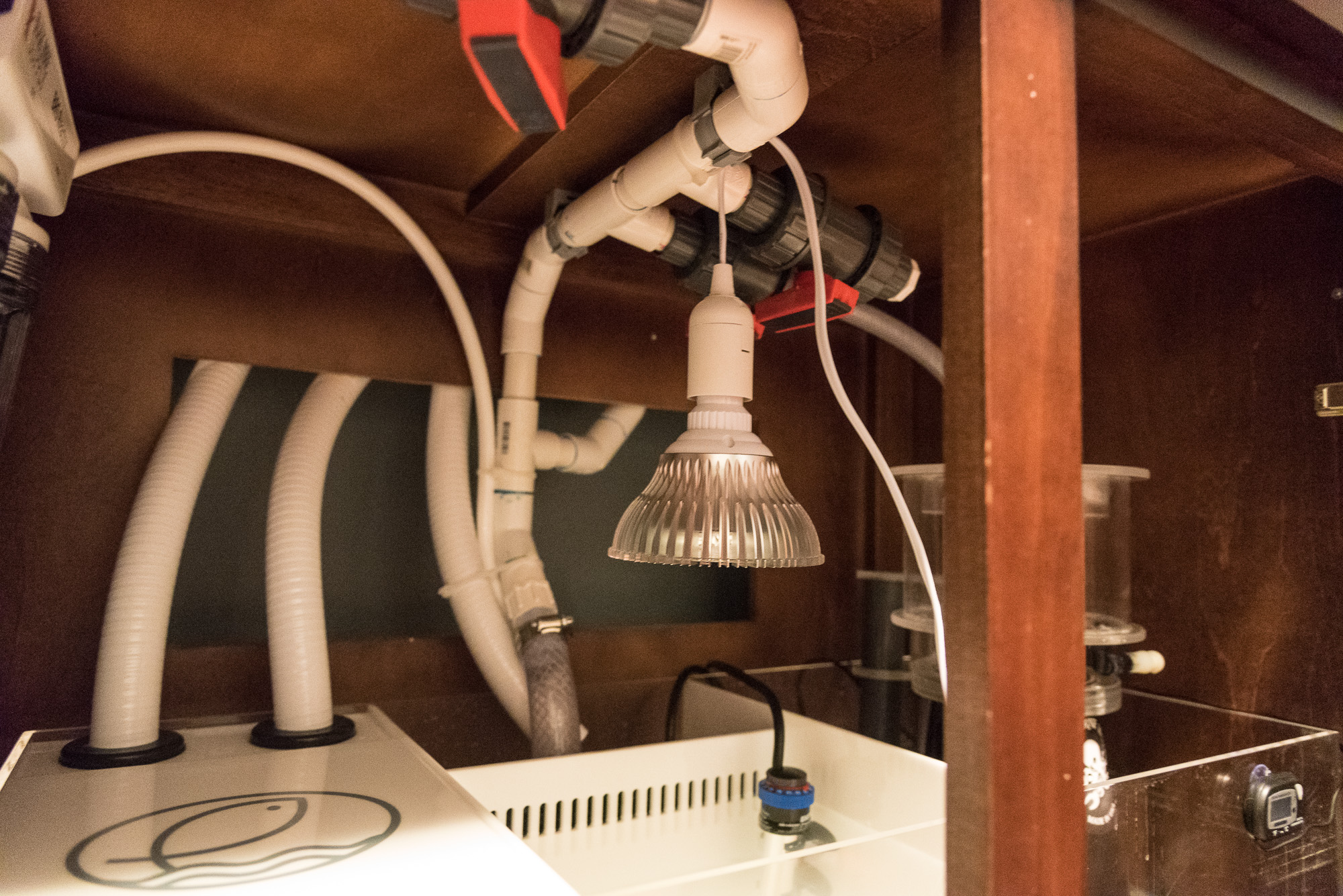 In the refugium I also decided on an LED light to save heat and electricity. After a lot of research I settled on a pretty standard PAR-38 flood light with a special red/blue horticulture configuration. From what I understand the bulb I got is the same exact thing is the Reef Breeders “Fuge Light” which is $99, except I got mine on Amazon for $20. I am running it in a traditional reverse 12-hour photo period configuration.