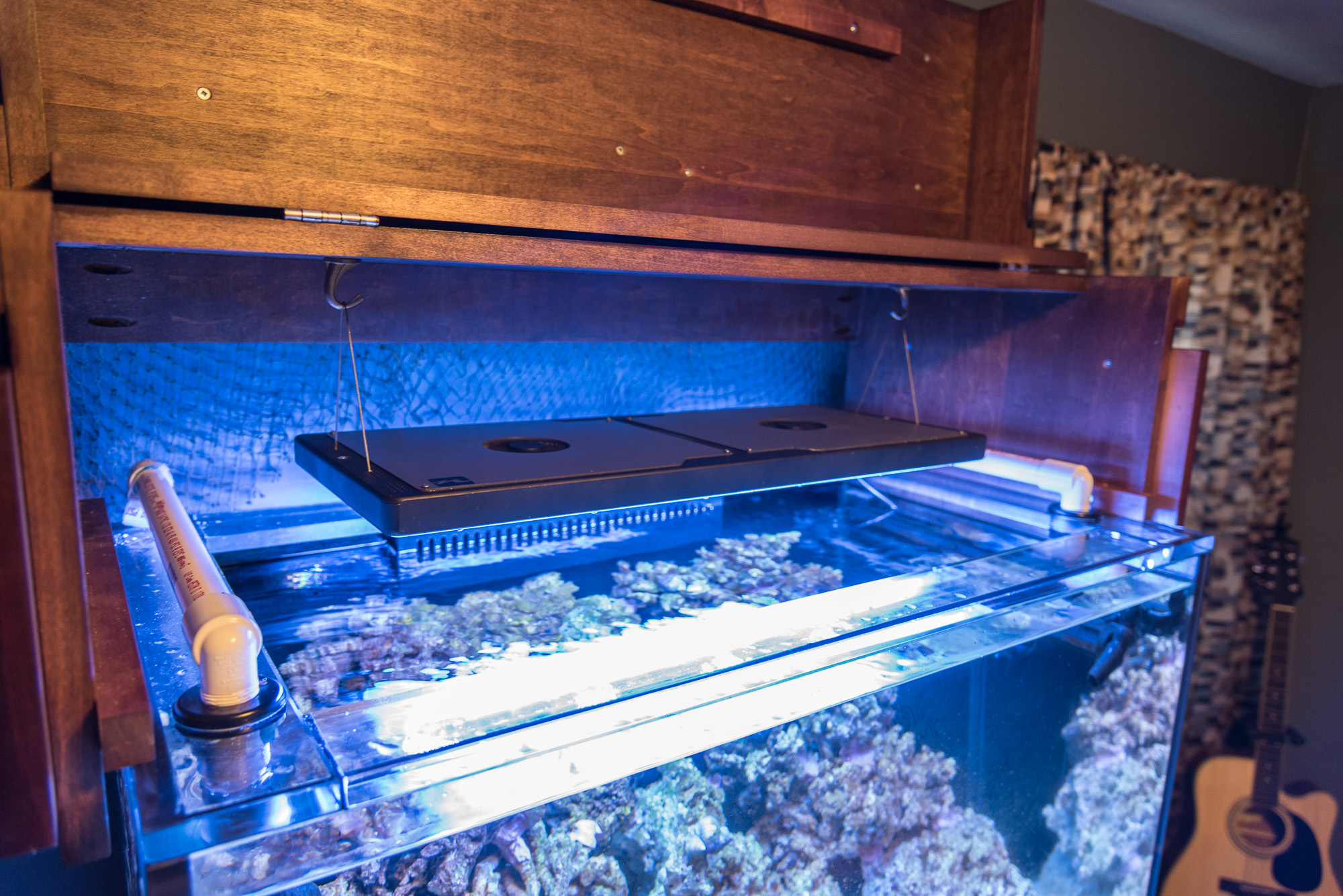 There was no aspect of the tank I labored over more in my decision than the lighting. I knew I wanted to use LED primarily and after a lot of reading I ultimately settled on wanting a hybrid LED/T5 setup. This was mostly due to the people who swear by MH/T5 leaving doubts in my mind over the quality of LED by itself, but was also due to wanting the ability to have extremely high lighting if I needed it as well as having the T5 supplement to fill in some shadowed areas. There are a LOT of really nice lights out there but adding in the desire for T5 supplements pretty much removed AI, EcoTech, Kessil, etc. from the running. I was torn between a custom setup from an ATI fixture, a Pacific Sun hybrid unit, an ATI Hybrid unit and this little known newcomer to the market Nanobox. After talking to Dave Fason (the owner of Nanobox) for a while, I settled on Nanobox. This is mostly because I really enjoy supporting small, US based businesses, but also because he has a cult-like following and his lights are really a sight to behold. He makes each until 100% by hand, himself. The arrays are designed by him. They may not have 9-channels or some of the other bells and whistles of a Radion, but what they lack in features they make up for in raw output. The fixture I settled on was a custom 24″ wide Nanobox Hybrid with 4x 24w T5 bulbs on dedicated reflectors, 4x 13-LED Nanobox v.3 arrays, and a dedicated moonlight channel. Custom painted black with gunmetal accent colors. This is controlled by the Bluefish Mini WiFi lighting controller and while the UI needs some refinement it has all the features one would expect. I am currently using the lunar cycle simulation, cloud simulation for a location in Fiji but I am not using the storm simulation feature. I have 3-channels of control, the whites, the blues, and the moonlight. It would be nice to have greater control over the output spectrum but sometimes keeping it simple makes things a bit better.